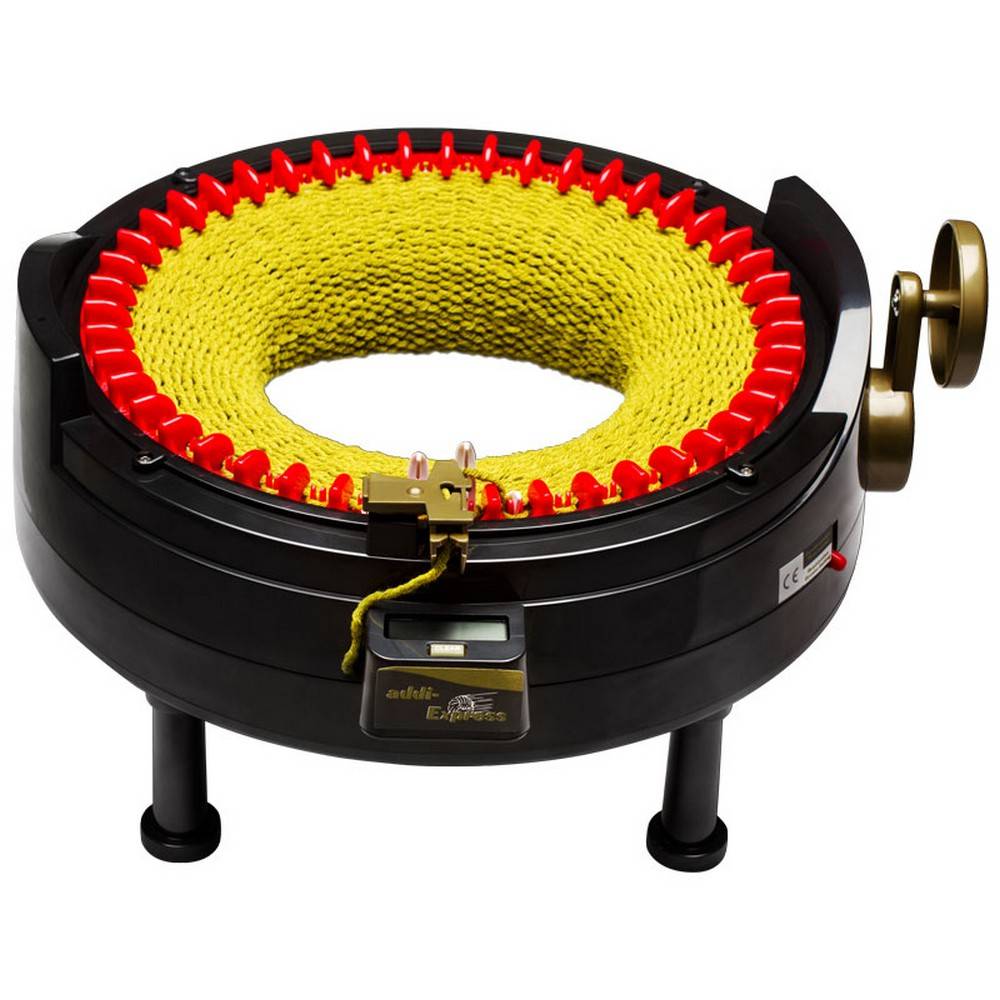 У такой вязальной машины 44 крючка. Они расположены по кругу. Кроме этого, конструкция предполагает наличие ручки, с помощью которой можно вращать механизм такой машинки. Есть устройство, которое натягивает нитку. Чтобы пользоваться машиной было удобнее, сверху расположена ручка – за нее можно придерживать прибор. При желании можно создавать круговое или ровное полотно, в первом случае используются все крючки, во втором – лишь 40. К сожалению, прибавлять/убавлять петли такая вязальная машина не позволяет. Очень удобно вязать на таком устройстве варежки и шарфы, но, если приложить усилия и наловчиться, то возможно создавать и свитера, и пледы, и накидки, и многое другое.