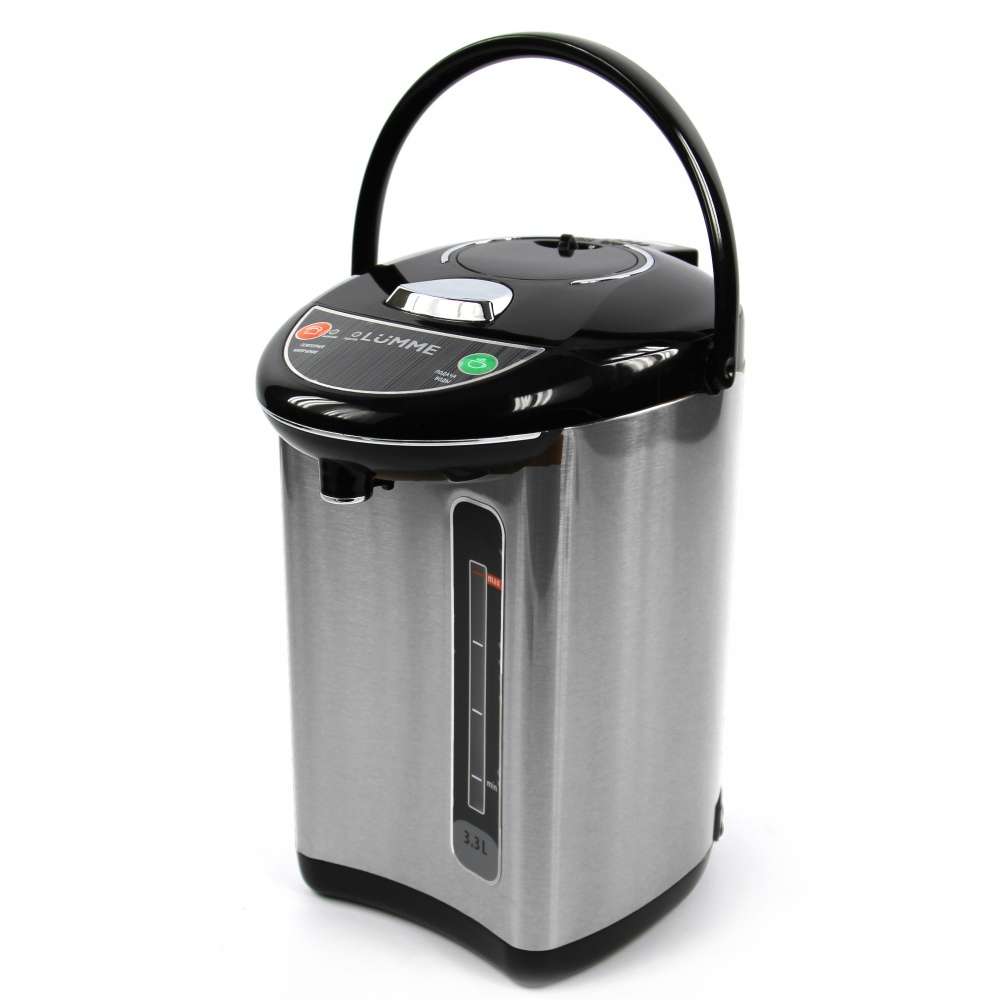 - Limme LU-299. Термопот объемом 3,3 л. Мощность прибора — 750 Вт, в режиме поддержания температуры составляет 30 Вт. Внутренняя колба выполнена из металла. Модель оснащена ручным и автоматическим насосом. Закрытая спираль нагревательного элемента. Корпус выполнен из металла с двойными стенками. Блокировка включения без воды и блокировка панели управления позволяют устройству работать в семьях с маленькими детьми. Эксперты отмечают его безопасность. Хозяйки выбирают этот прибор из-за современного дизайна. Цена около 3,5 тыс. руб.