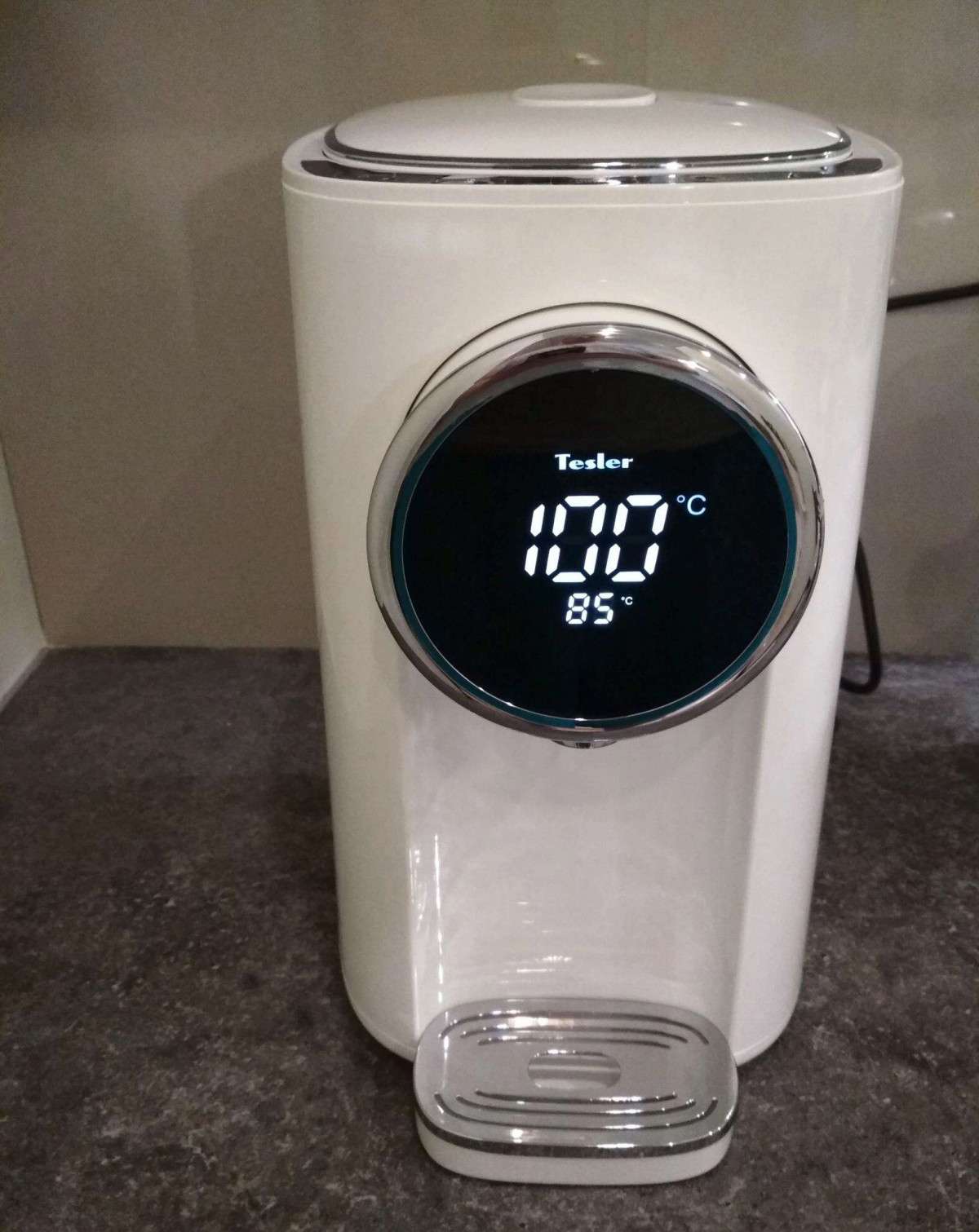 - Tesler TP-5055. Вместительный прибор объемом 5 л. Специалисты советуют это устройство большим семьям с детьми. Мощность — 1200 Вт. Автоматический насос, материал корпуса — пластик с двойными стенками. Съемная крышка и индикация включения. Есть дисплей, сенсорное управление, функция поддержания тепла, индикатор уровня воды. 6 температурных режимов от +45 до +100°C. Хозяйки отмечают высокую безопасность модели. Средняя цена — 5 тыс. руб.