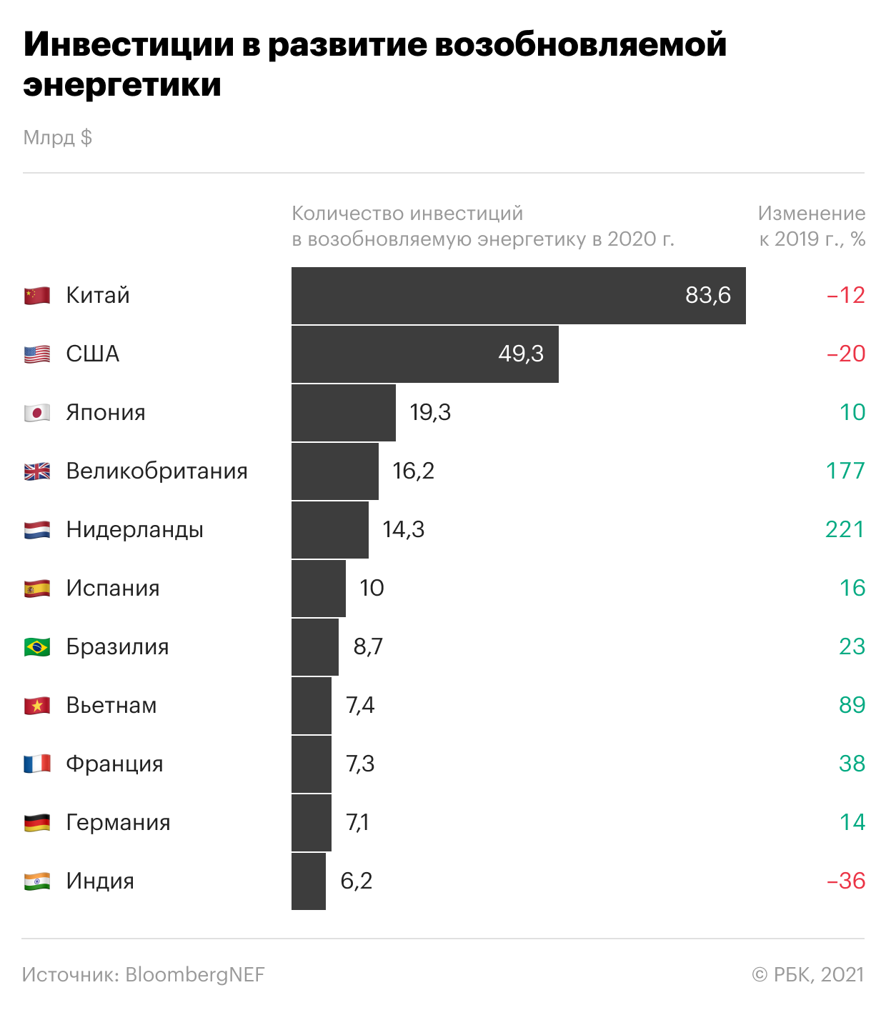 Пока же в лидерах инвестиций в развитие возобновляемой энергетики — Китай, США, Япония и Великобритания. С тех пор, как BloombergNEF начал отслеживать эти данные, глобальные инвестиции в ветровую и солнечную энергетику, биотопливо, биомассу и отходы, малую гидроэлектроэнергетику увеличились почти на порядок. В годовом выражении вложения в чистую энергию выросли с $33 млрд до более чем $300 млрд за 20 лет.
