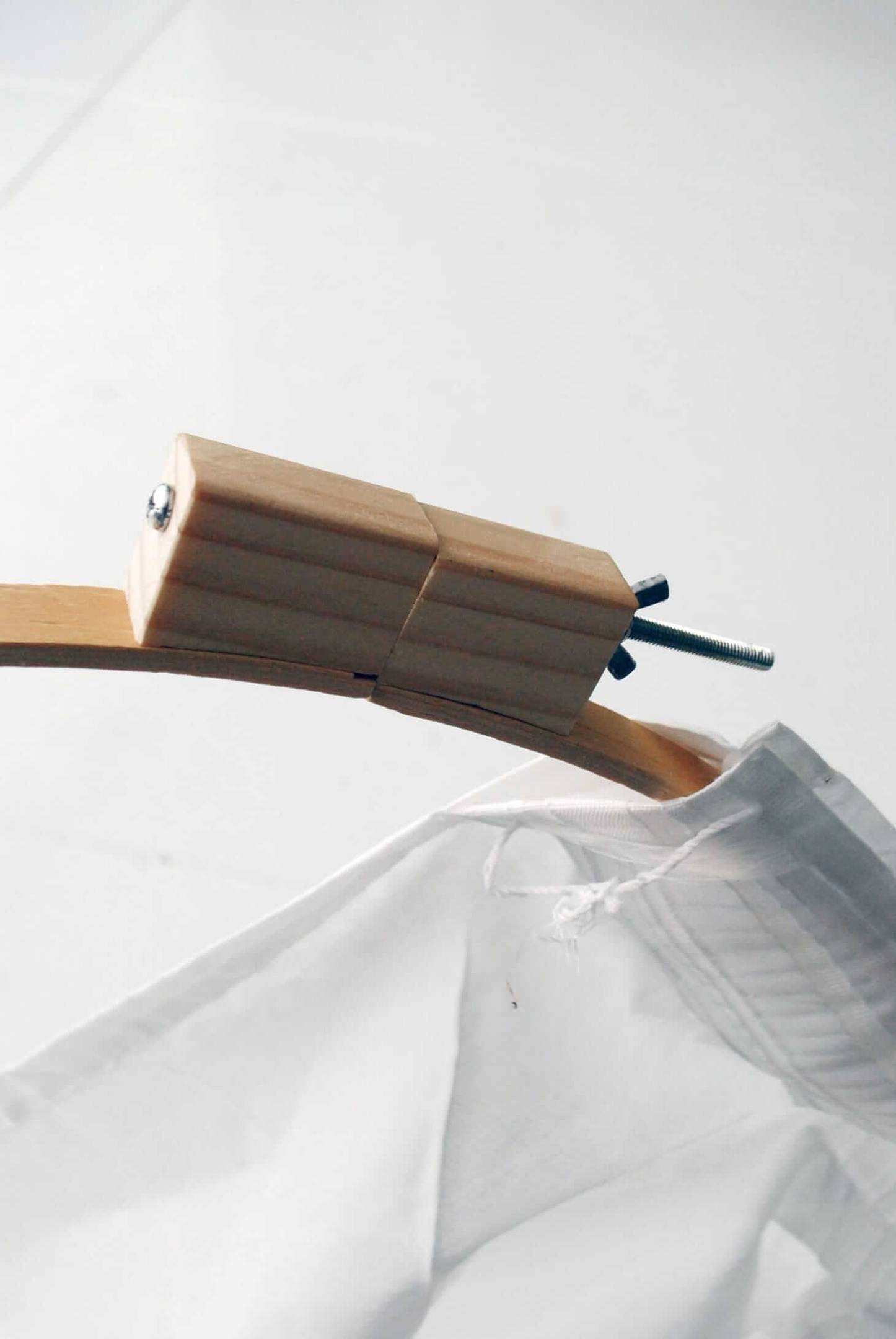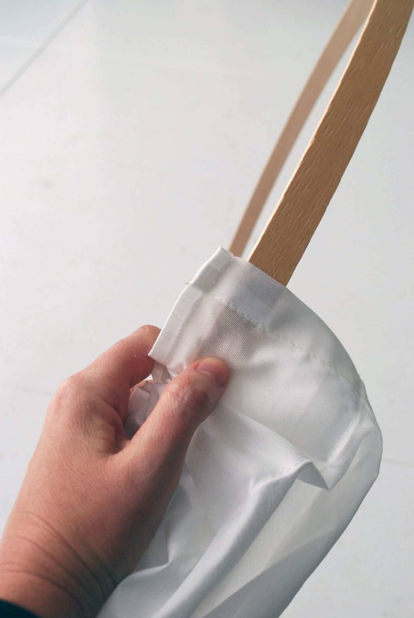 Пяльца можно использовать в качестве держателя. Их необходимо зафиксировать на потолке при помощи потолочного крючка, который используют для крепления люстр. На круг с помощью липучек или лент в тон ткани нужно закрепить материал.