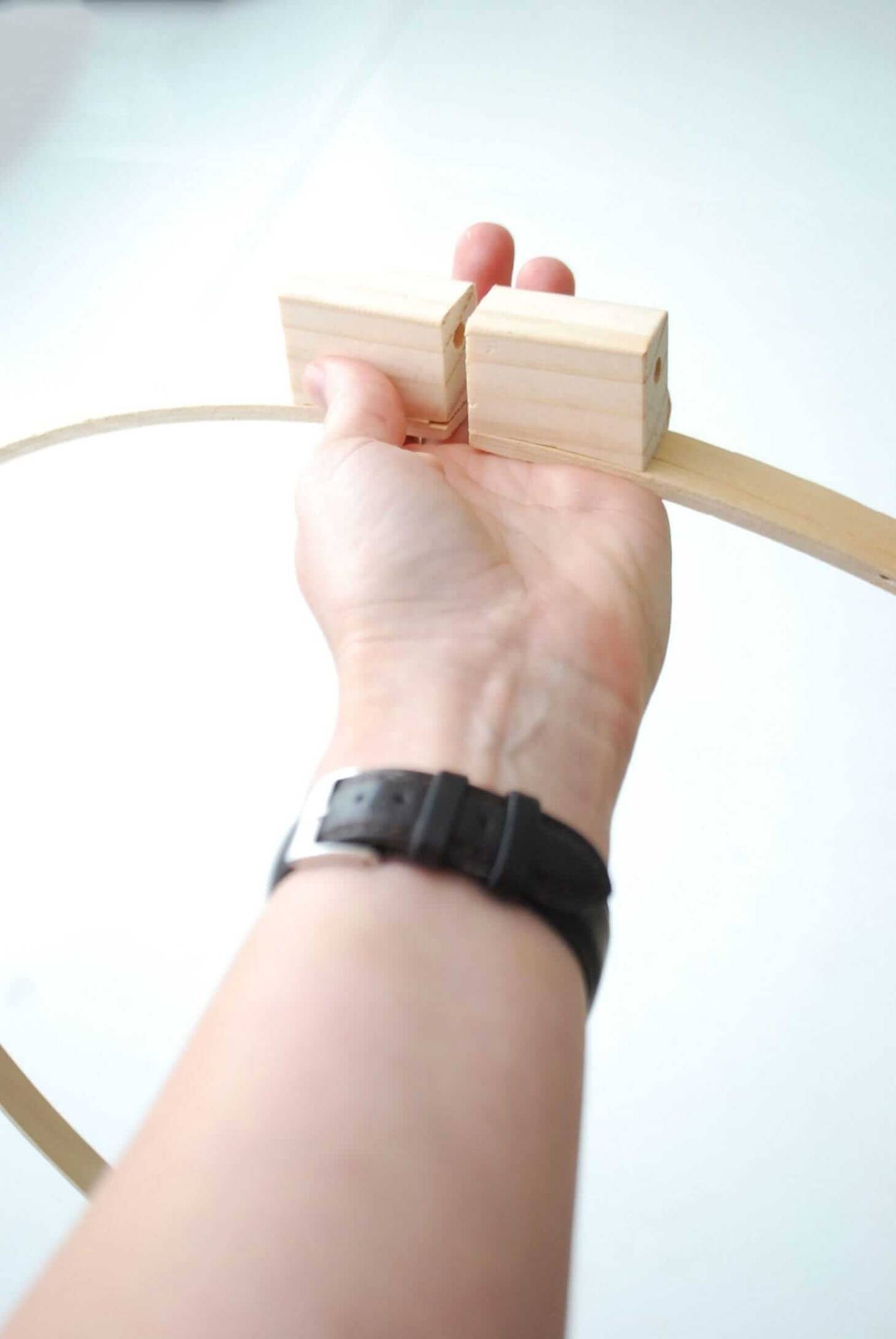 - Если круг широкий сразу крепите мини конструкцию к потолку где уже висит крюк, и к нему же прикрепляйте ткань, а круг придаст форму.