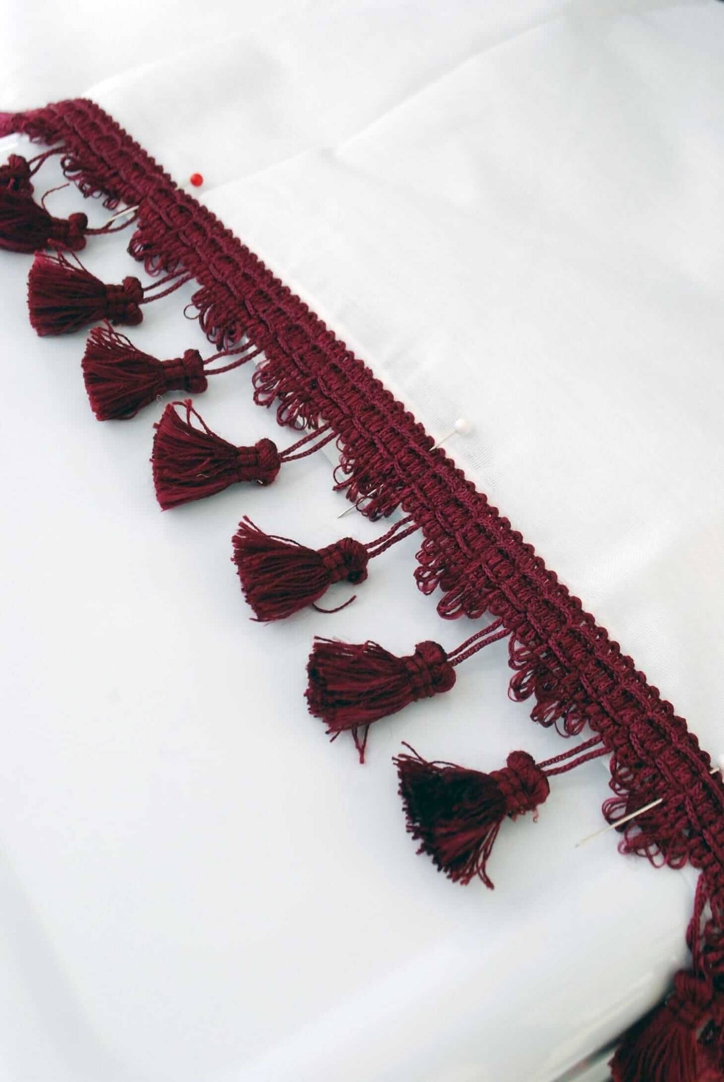 - Ткань вырежьте под каждую сторону изделия, обработайте края. Сверху пришейте драпировочную ленту, к которой закрепятся крючки.
