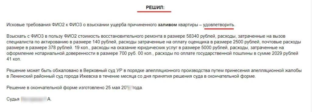 Следует также помнить, что стороны по делу на любой стадии процесса могут заключить мировое соглашение, то есть если и вы, и пострадавший согласитесь на выплату какой-то суммы в счёт возмещения вреда от пролива или на проведение ремонта, суд это зафиксирует и дело закроет. В этом случае расходы, понесённые сторонами по делу, не возмещаются, а с вас уже никто не имеет права требовать платить за пролив.