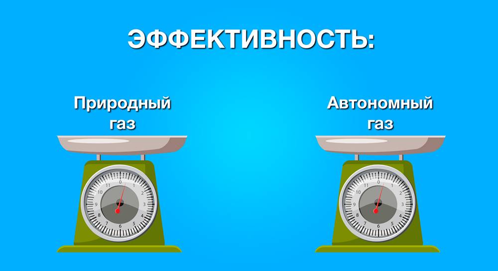 При отоплении частного дома газом коэффициент полезного действия установленного оборудования остаётся одинаковым. При этом стоимость природного и сжиженного газа меняется синхронно в неизменных соотношениях.