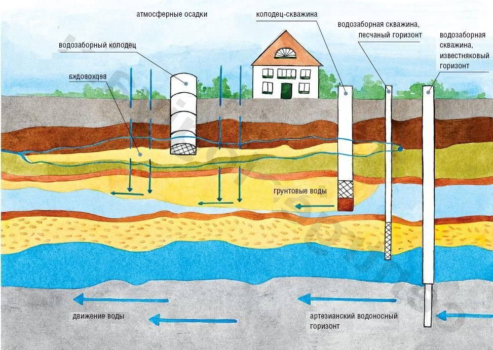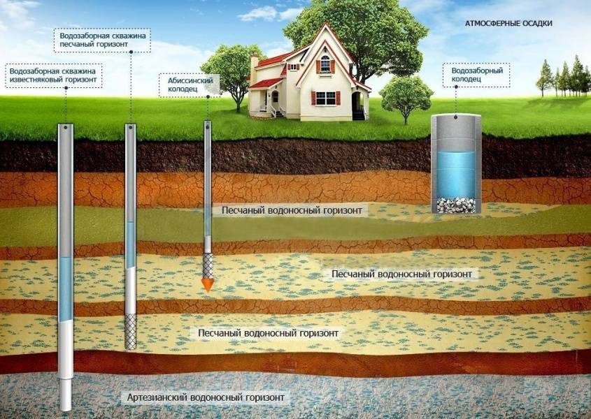 Существует 2 варианта скважины — песчаная (или межпластовая) и артезианская (еще называют бурением на известняк).