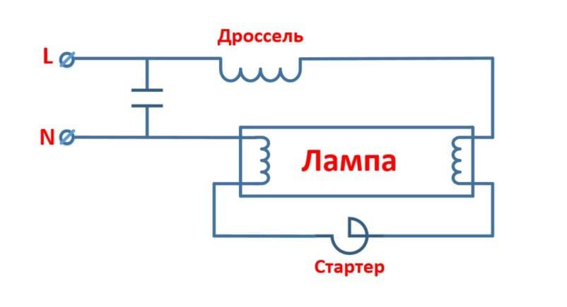 Эта схема называется еще электромагнитный балласт (ЭМБ), а схема работы электромагнитное пускорегулирующее устройство — ЭмПРА . Часто это устройство называют просто дросселем.