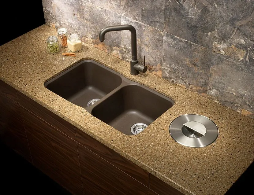 Двойная раковина на кухне занимает заметную часть пространства, поэтому хочется оформить ее эстетично, в гармонии с мебелью, декоративным оформлением комнаты. Хорошее впечатление производят изделия, сделанные из композитов, в состав которых входит крошка натурального гранита, керамогранита, мрамора или кварца. Природное сырье связано в единое целое полимерными компонентами, для придания окраски к массе добавлены пигменты.
