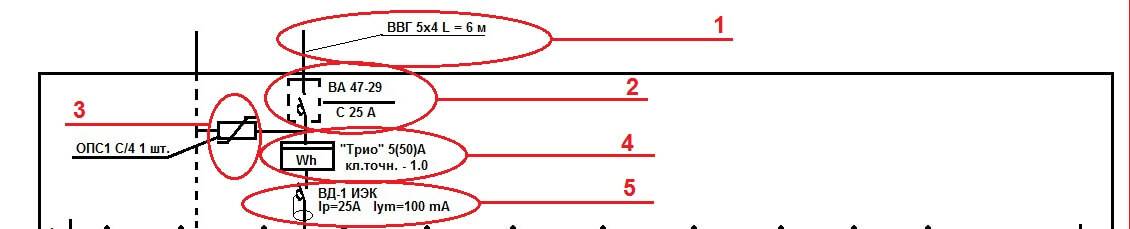- Вводной кабель ВВГ 5 х 4 (5 медных жил по 4 кв. мм каждая); L = 6 м – его длина от точки соединения с кабелем от питающего столба до входа в щит – 6 м – в нашем случае, так как дом деревянный, проникает в дом через наружную стену, исключительно в стальной трубе.