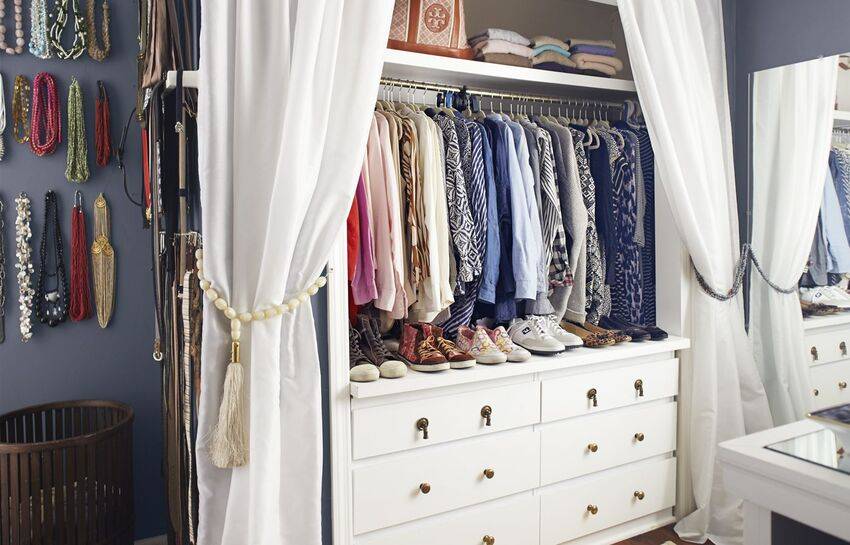 Отказ от дверей в гардеробных и использование ширм или занавесок — еще один вариант оформления входа.