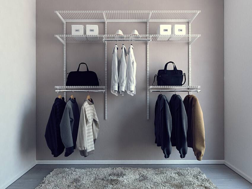 Отличный пример мини-гардеробной, которая занимает мало места. Каркас и полки для нее нужно подбирать под цвет стен, чтобы они не выделялись на их фоне.