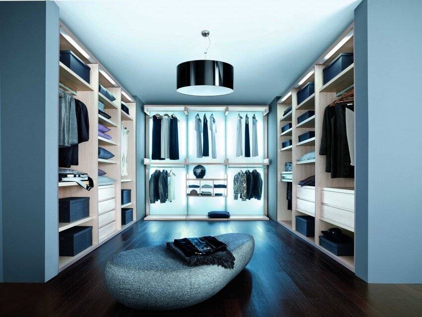 Кладовка – самое темное помещение в квартире. Можно снабдить гардеробную точечными светильниками и настенными лампами. Дополнить подсветкой для одежды (мини Led-лампочки) и внутренним освещением ящиков (светодиодные ленты).