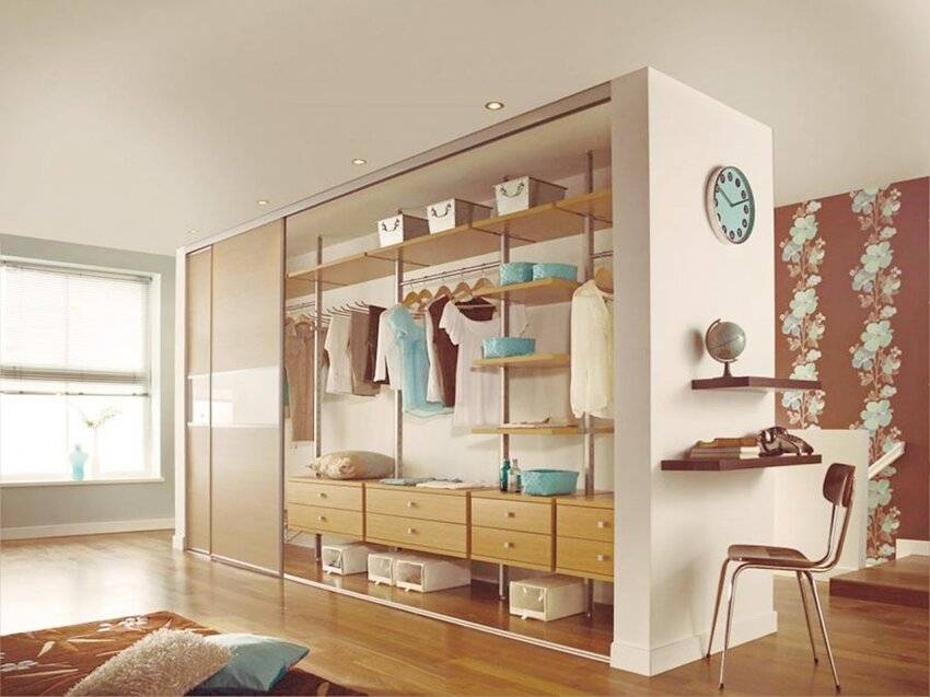 Открытая гардеробная, не отгораживается перегородками и дверьми и является продолжением комнаты.