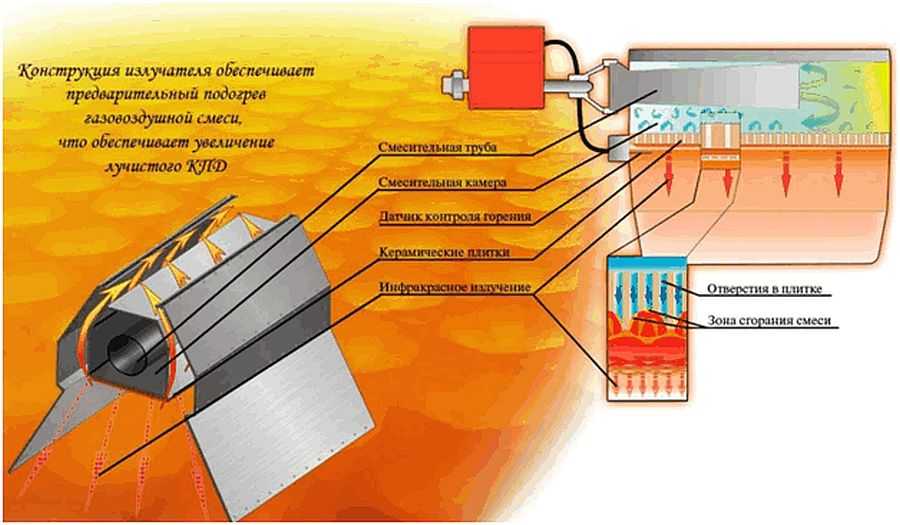 Принцип работы газового инфракрасного обогревателя схож по конечному итогу с электрическим — здесь тоже выделяется лучистое тепло в инфракрасном диапазоне. Но для его создания используется керамическая пластина. Она нагревается от подачи природного газа и воздуха, объединяющихся в смесительной камере, где происходит беспламенное горение. В результате основное тепло отдается пористой керамической пластине. Нагретая керамика начинает отдавать ИК-лучи в помещение.