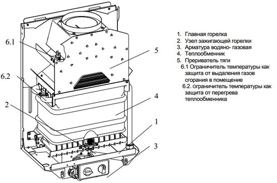 Это одна из лучших газовых колонок в бюджетном сегменте. Тепловая мощность – 20 кВт. Этого значения достаточно для небольшой семьи при ежедневной эксплуатации. Открытая камера сгорания снижает габариты прибора и способствует эффективному удалению отработанных газов.