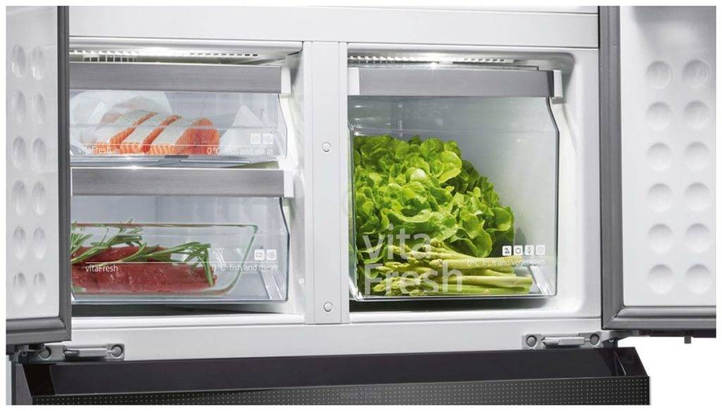 В холодильниках обеих марок есть зона свежести, в которой поддерживается температура около 0°С. Присутствует несколько регулируемых отдельных отсеков, где можно хранить не только кисломолочные продукты и зелень, но и рыбу с мясом.