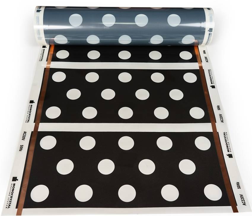 Инфракрасное пленочное покрытие представляет собой рулонный материал. Это карбонатная паста, что запаяна в полиэстеровую или полипропиленовую пленку. По краям устанавливаются специальные токопроводящие шины. Чаще всего это полосы из серебра и меди. Именно по ним передается электрический ток. После того, как он проходит через карбон выделяется тепло.