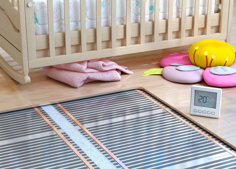 Можно найти простой выход. Под напольное покрытие из ламинатной доски устанавливается сплошная инфракрасная пленка. Можно ограничиться согревающим ковриком из инфракрасной пленки, но он представляет собой обогреватель, и малыша без контроля возле него оставлять не рекомендуется.