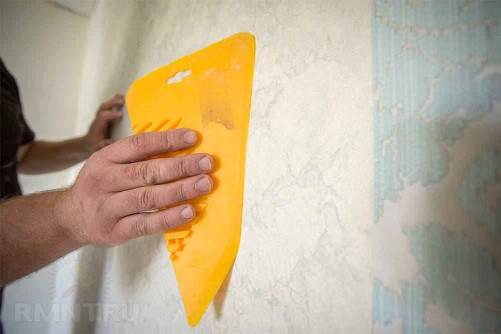- Подготовка поверхности — удаляют старое покрытие, производят очистку стены от загрязнений. Счищают осыпающуюся штукатурку, отрывают фрагменты старых обоев. Если остались неровности, стенку выравнивают при помощи шпаклевки и шпателя.