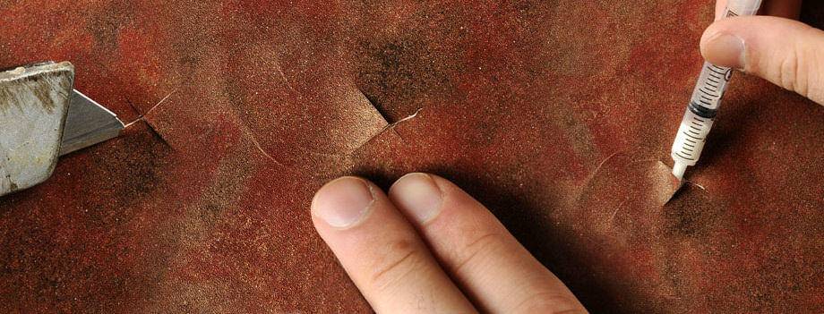 При устранении больших воздушных карманов единичными проколами с впрыскиванием клея не обойтись. Для устранения обширных полостей нужно аккуратно разрезать поверхность полотна канцелярским ножом и отогнуть отошедший участок. Далее, с помощью небольшой кисти нанести клей, в соответствии с рекомендациями производителя.
