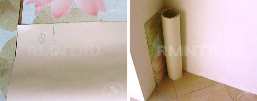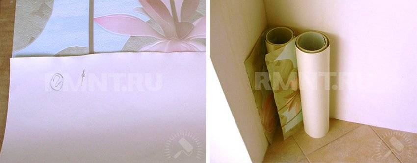 На чистом полу раскатывают два рулона. Тот, что на фотографии слева, уже обрезан в длину согласно нужной высоте с запасом не менее 10 см от этого размера. Второй рулон совмещается с рисунком на первой полосе и по его краям ставятся метки карандашом. Можно эти места надрезать ножницами.