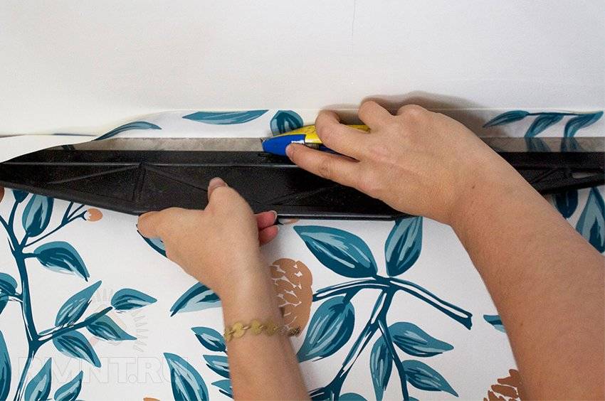 Несмотря на то что обои сырые, рез остаётся чистый, без задиров и ворса. Без обойной линейки выполнить аккуратно такую работу невозможно.