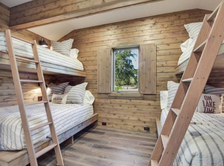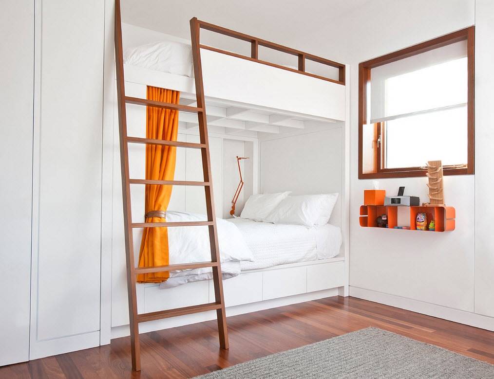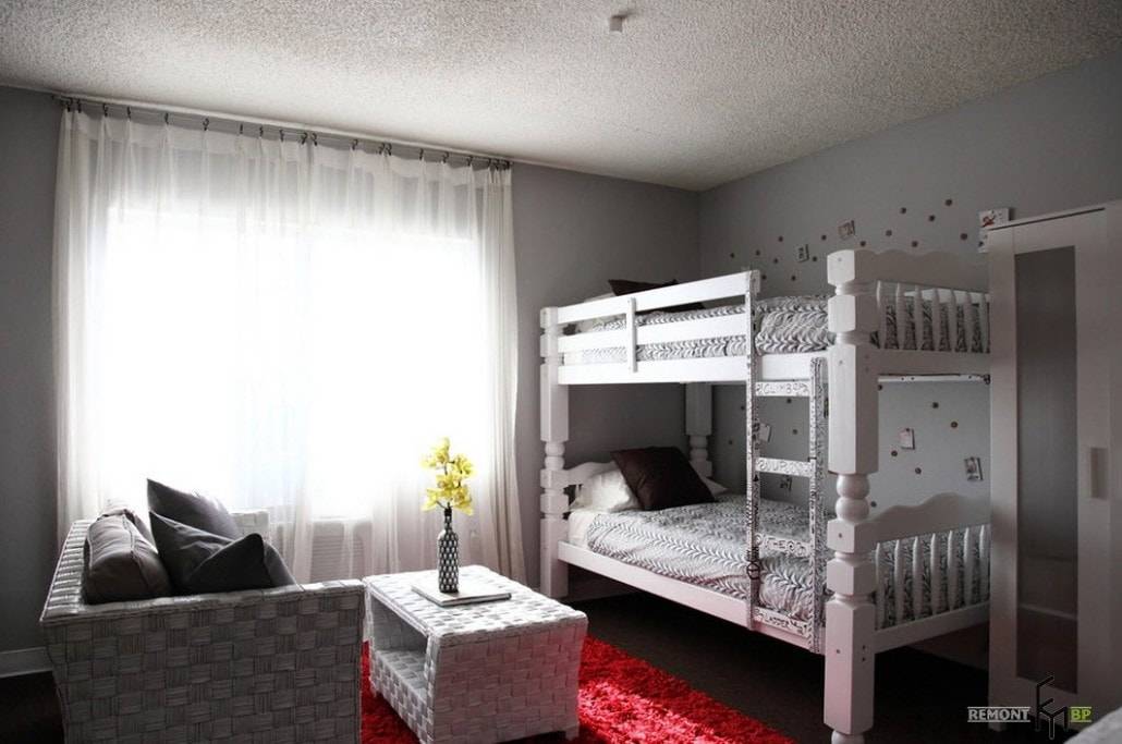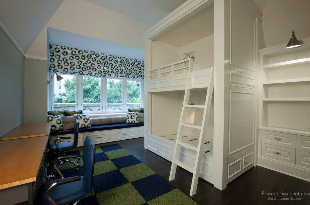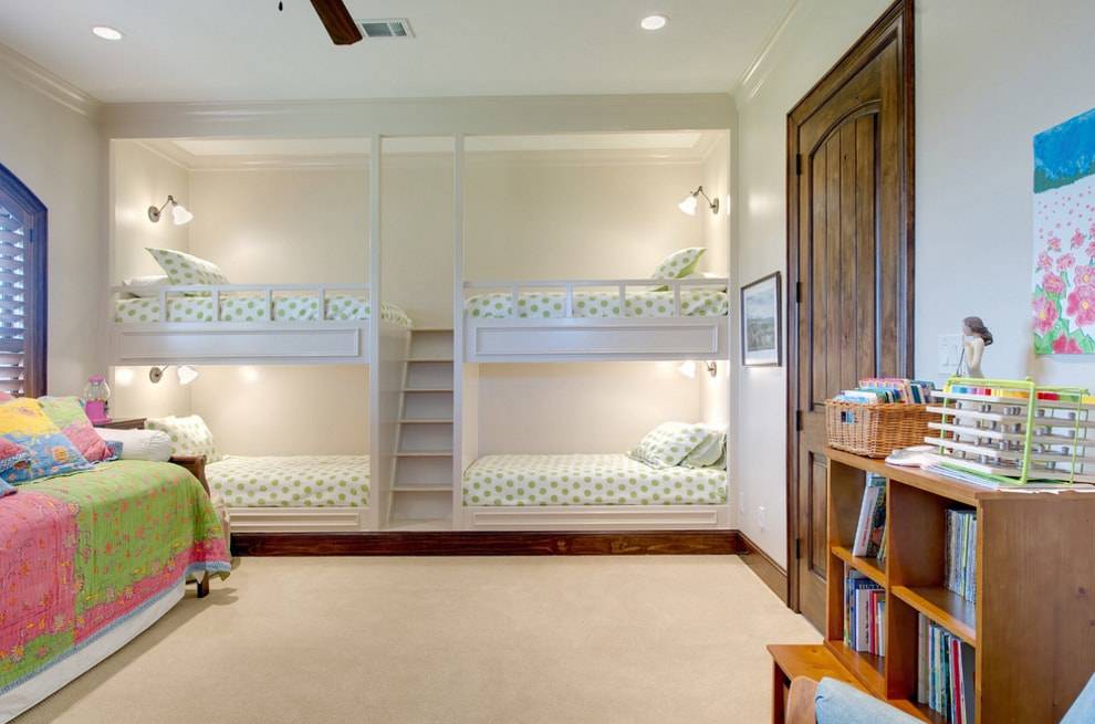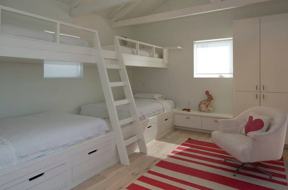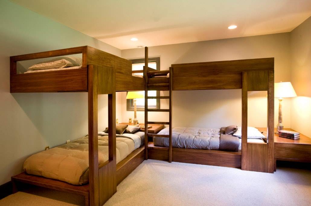 Двухъярусные кровати используются не только в малогабаритных спальнях, часто их устанавливают и в довольно просторных комнатах