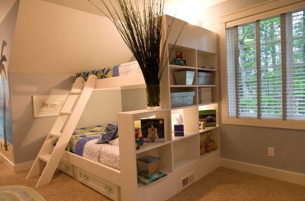 Традиционным односпальным кроватям и раскладным диванам тяжело справиться с такой задачей. Выходом из положения является установка детской двухэтажной кровати, размер которой необходимо подобрать с учетом взросления ребенка в течение последующих 5-7 лет.