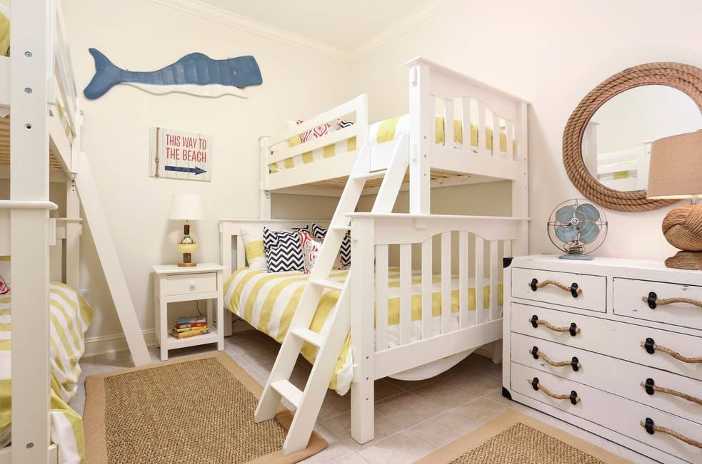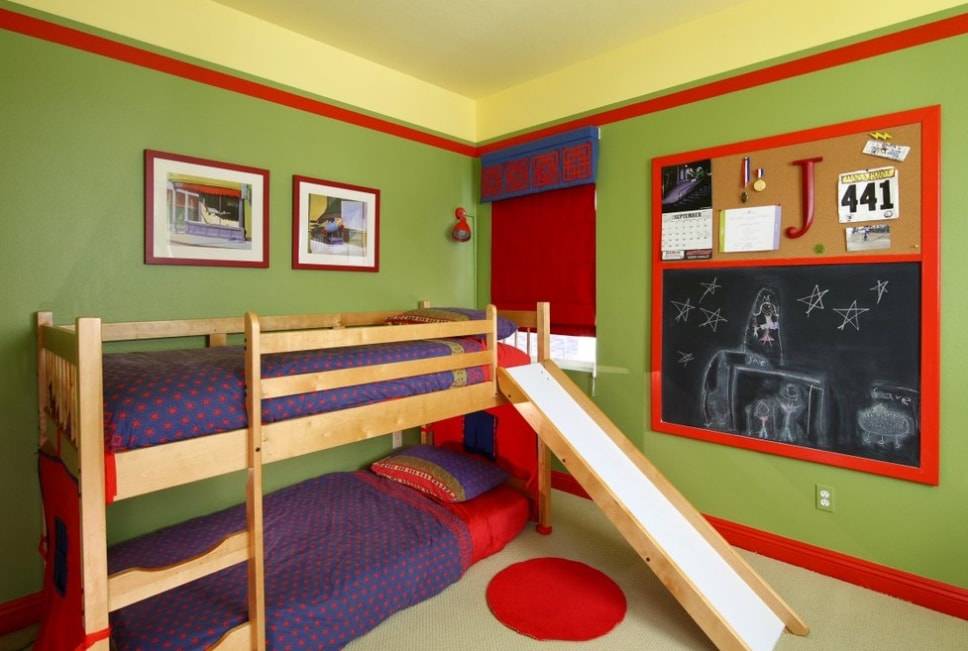 Когда в детской живет сразу двое детей, то стоит обратить внимание на двухъярусную кровать. Если родители не знают, куда лучше поставить конструкцию, то удачным выбором станет угол или середина со стороны длинной стены