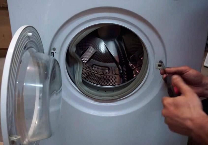 Обесточить агрегат, поднять его верхнюю крышку, снять саморезы, которые удерживают блокирующую деталь. Чтобы было удобно, прибор наклоняют, надавливают на язычок замка рукой, и тогда дверца разблокируется. Снимают фиксирующий хомут, немного отодвигают правую сторону манжеты, просовывают руку в освободившееся пространство и выкручивают саморезы. Надо запомнить порядок действий, чтобы в дальнейшем правильно поставить новое устройство. Для проверки стиралку подключают и запускают стирку.