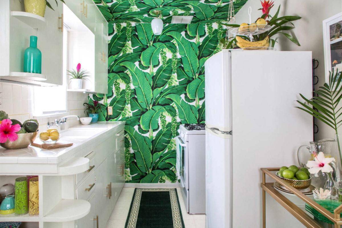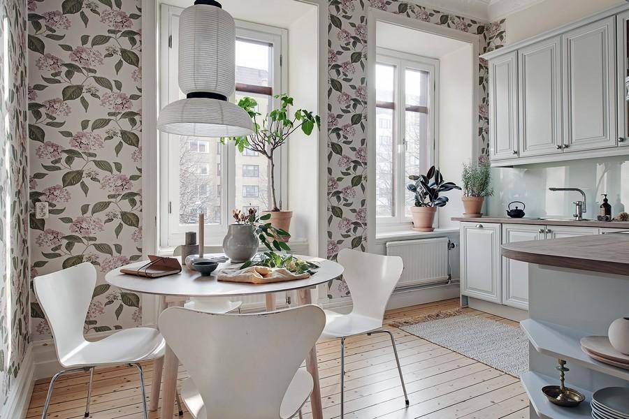 Рисунок и цвет покрытия может зрительно уменьшить или увеличить пространство. Отделка помещения — это фон, на котором мебель должна выглядеть солидно. Есть несколько вариантов поклейки, которые можно применить и к маленькой, и к большой кухне.