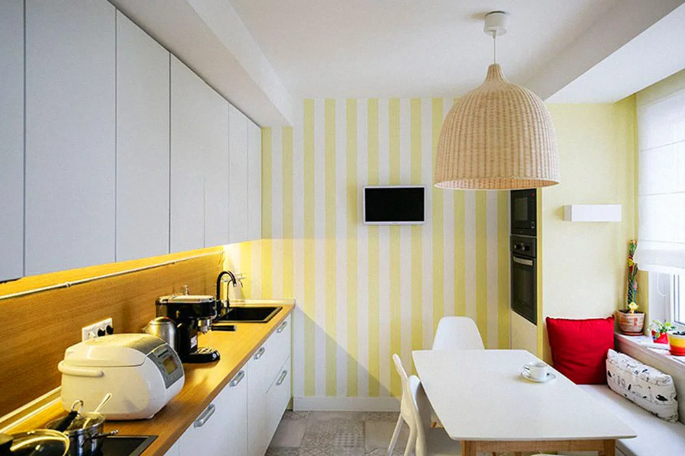Грамотно сочетание цветов, фактур и рисунков поможет тебе визуально преобразить маленькую кухню. Возьми за основу однотонное светлое или пастельное покрытие и сочетай его с узорчатыми или геометрическими вставками. Например, вертикальные полосы могут зрительно поднять потолок, а широкие вставки – раздвинуть стены.