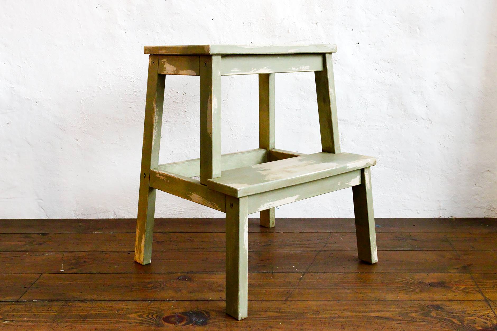 Второй этап — подчеркивание трещин. На старых, видавших виды предметах они сами постепенно заполняются грязью и пылью, проявляя свой рисунок, но декораторам ждать годы или возить по мебели грязными руками необязательно: проще и надежнее использовать темный воск для состаривания. Дождавшись, когда поверхность предмета остынет, нанесите его кистью, а затем круговыми движениями хлопковой тряпочкой вотрите в трещины. Для нежно-фисташковой лесенки было решено использовать коричневый воск, для более темного предмета подошел бы и черный.