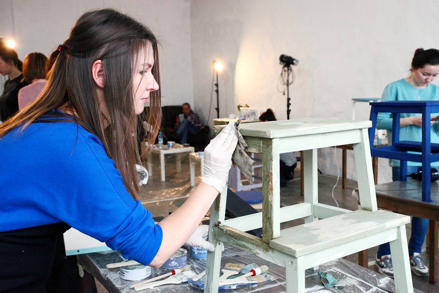 Еще один способ составить вещь – сымитировать трещины, какие появляются на краске со временем. В декупаже для создания такого эффекта, используют кракелюрный лак, но участницам мастер-класса он не понадобился. Даша объяснила, как сымитировать кракле при помощи обычной краски, фена для волос и воска.
