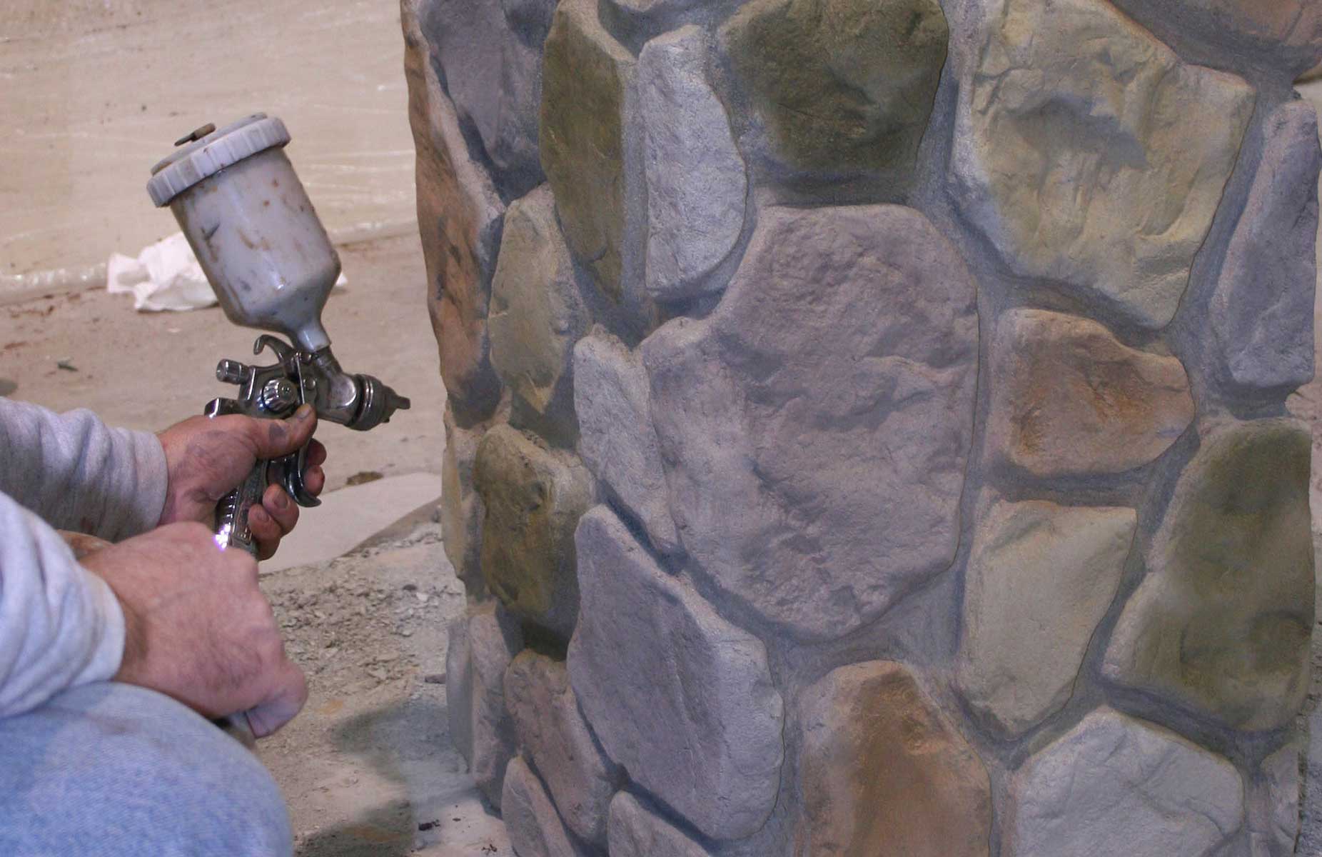 Для покраски искусственного камня из гипса применяют акриловые, силикатные и силиконовые лакокрасочные материалы (ЛКМ). Чаще всего они изготовляются на водной основе. Для окраски изделий, предназначенных для отделки наружных стен, используют ЛКМ, устойчивые к внешним воздействиям. Гипсовую плитку можно красить в массе, т. е. красящий пигмент вносится в раствор перед заливкой форм. Основной оттенок получает все изделие. Такой способ применяется при монтаже в местах, где возможно механическое повреждение покрытия.