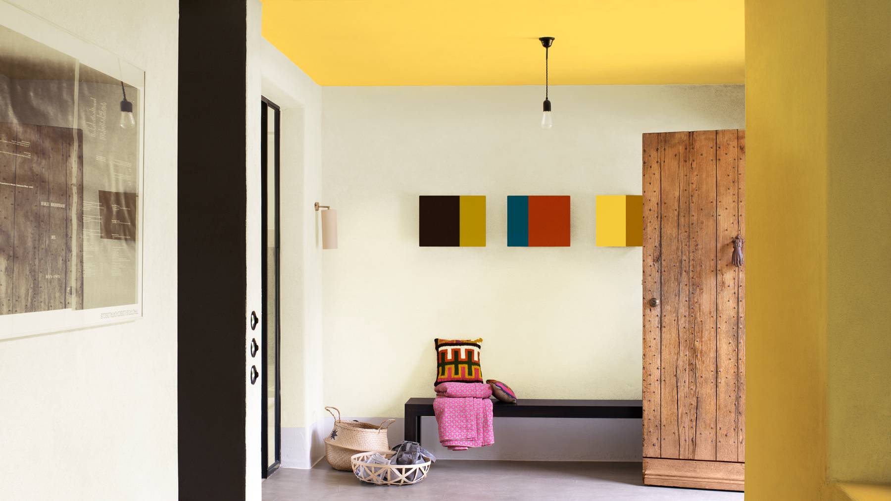 Неожиданно яркий потолок, окрашенный в смелый оттенок, может привнести весну и энергию в ваш дом или квартиру. В интерьер добавьте ковры, деревянные аксессуары, корзинки, подушки из натуральных тканей. В этом случае лучше стены окрасить в светлых тонах, чтобы сохранить равновесие.