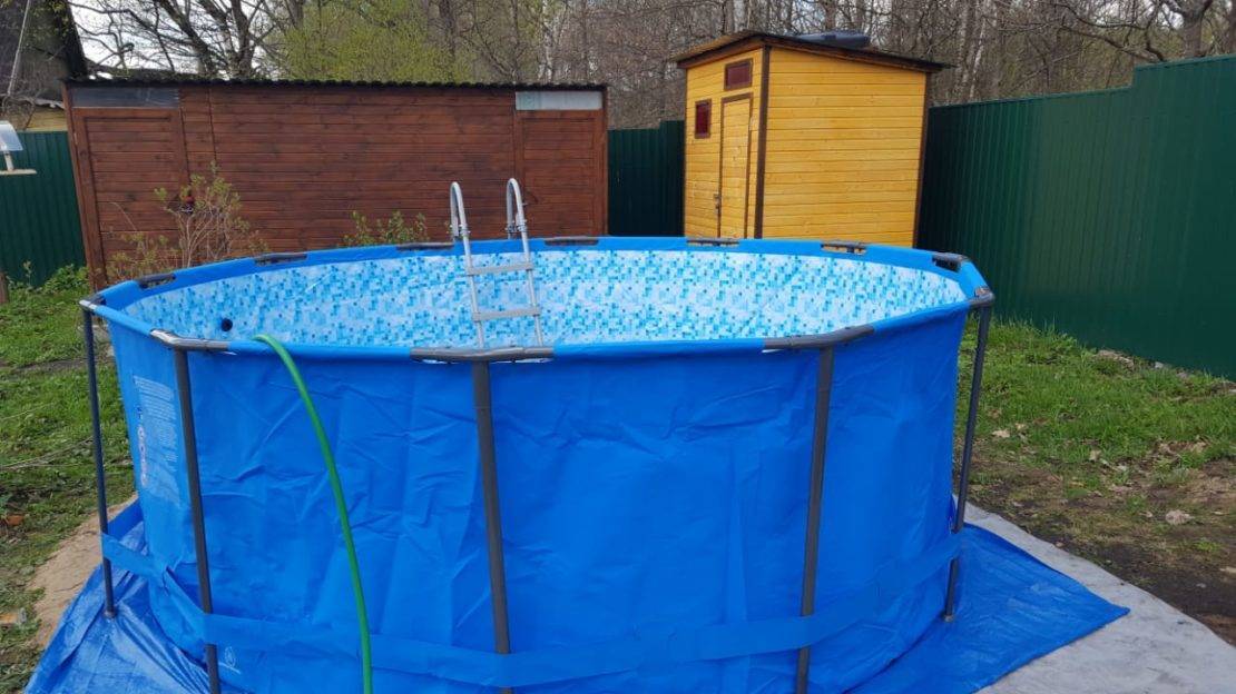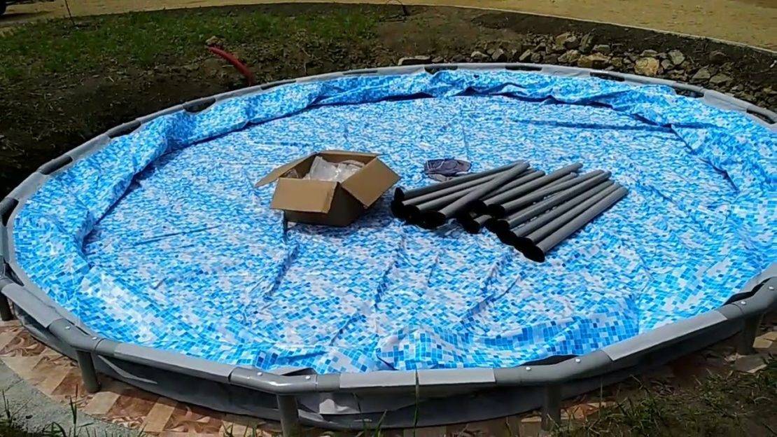 - Каркасный. Если вы всё-таки хотите более глубокий вариант, но при этом не хотите монолитную громоздкую конструкцию, этот вариант для вас. Он стоит дороже, а монтировать его дольше и сложнее. Это разборной бассейн, который можно собрать своими руками. Он состоит из труб, которые служат каркасом, и пленки, которая обеспечивает герметичность. Глубина может достигать двух метров.