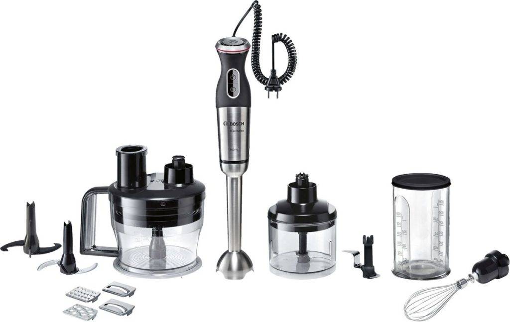 - Bosch MSM 88190 имеет в комплекте две чаши и погружной миксер. Нарезает овощи, замешивает тесто, делает пюре, взбивает коктейли, колет лед.