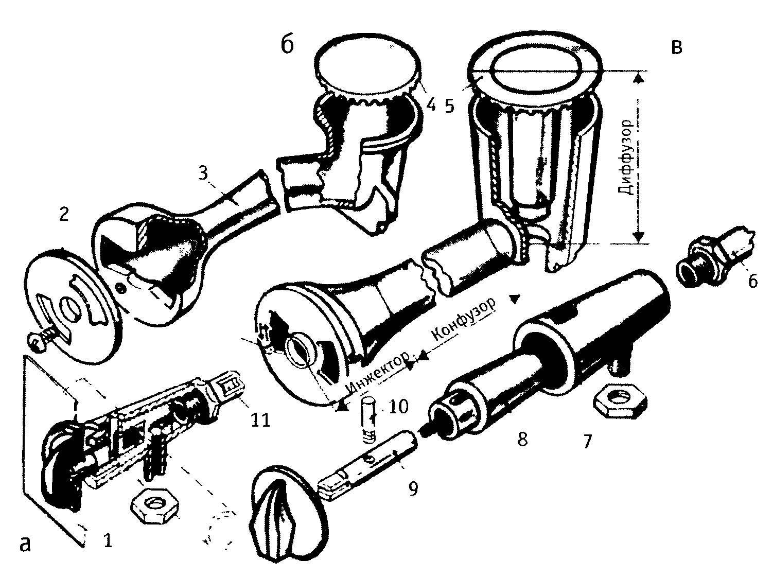 Рис. 1-10-7. Части газового тракта газовых плит прошлых лет выпуска: а — пробковый кран, б, в — горизонтальные горелки; 1 — щиток; 2 — регулятор первичного воздуха; 3 — корпус горелки; 4 — колпачок; 5 — насадка; 6 — газопровод; 7 — корпус горелки; 8 — пробка; 9 — стержень; 10 — стопорный винт; 11 — сопло горизонтальное