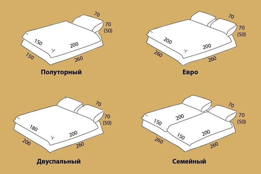 | Полуторная | 120 × 190 см. | Скандинавия (IKEA) 140 × 200 см, Англия 120 × 190 см. | – |