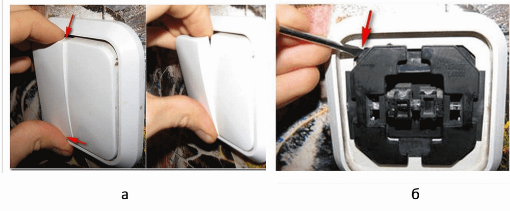 Снятие клавиш (а) и рамки (б) с выключателя своими руками