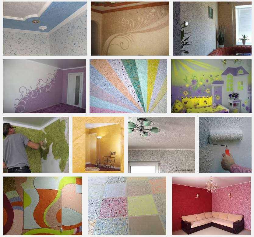 Шелковая штукатурка поставляется в разных цветах, благодаря использованию составов различных оттенков можно создавать рисунки на стенах и потолке. Это делают с помощью трафаретов или переносят выбранное изображение на поверхность карандашом.