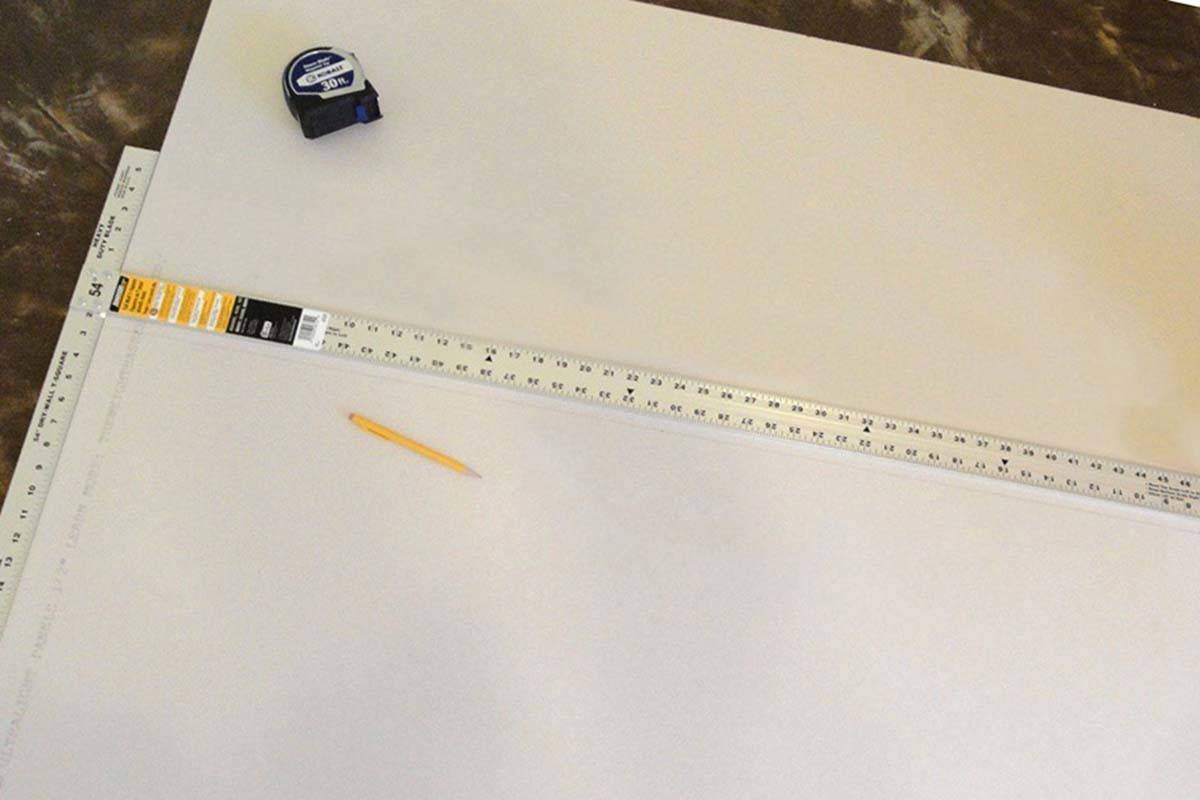 При нанесении основных линий нужно сначала сделать одинаковые отметки наверху и внизу листа. После этого приложить к точкам линейку или уровень, с помощью которых можно провести прямую линию. Как только вы закончите вычисления, можно приступать к резке. Для этого картон нужно положить на поверхность, которая идет параллельно полу.