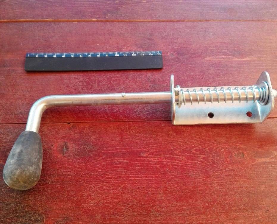 - Кронштейн и пружина соединяются с помощью регулировочной пластины, изготовленной из полоски железа. Крайние витки пружины используются в качестве зацепов, а к низу присоединяется регулятор натяжения из прутка. С одной из сторон получается кольцо, с другой – нарезается резьба.