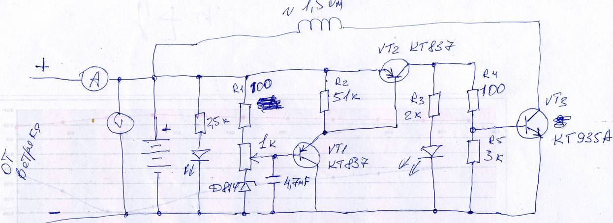Первая схема, наверное, самая простая которую можно придумать. Она отлично подойдёт к ветрогенератору мощностью до 200 Ватт. Эта схема была испытана , и успешно работала на моём первом ветрогенераторе