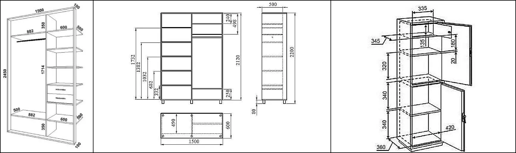 Не взирая, на особенности, для всех чертежей важно соблюдение чётких размеров. Длина, ширина и высота внешних частей и размеры внутренней составляющей, перенесённые на бумагу должны чётко соблюдаться при изготовлении шкафов