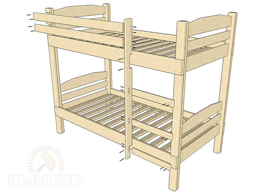 Рассмотрим подробнее, как можно сделать и собрать двухъярусную кровать для детей своими руками самому с помощью подготовленных элементов каркаса: вариантов конструкции существует множество, однако большинство собирается по единому принципу. Соберите царги по инструкции, после этого займитесь каркасом изголовья и спинки. Далее необходимо сделать следующее: