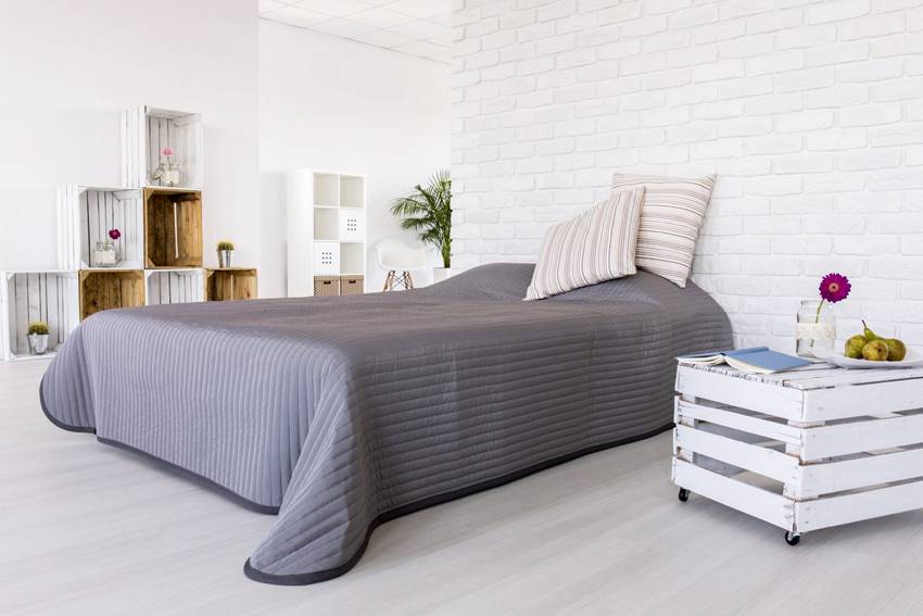 Такое решение полностью состоит из экологически чистых материалов и придется по нраву почти каждому владельцу. Доски из дерева, различные полотна, имитация забора на изголовье – все это максимально приближено к природным условиям.