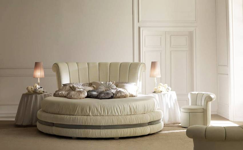 Можно своими руками сделать кровать круглой формы. Она будет являться необычным элементом помещения, способным не только его украсить, но и решить проблемные вопросы пространства с искривленными стенами. Данная конструкция в современных интерьерах устанавливается в центре просторного помещения, придавая ему королевскую роскошь.