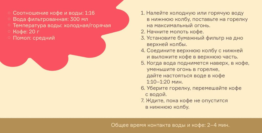 Для тех, кто любит чистый черный напиток и экспериментирует с оттенками вкуса разных сортов. Сначала вскипятите воду, а затем налить ее в нижний резервуар. Аккуратно соберите устройство и включите небольшой огонь. Будьте осторожны при сборке, кипяток нагреет металл за несколько секунд, так что снизу резервуар станет горячим, пользуйтесь полотенцем или прихваткой.